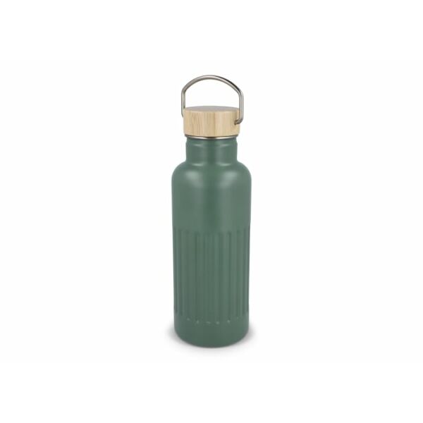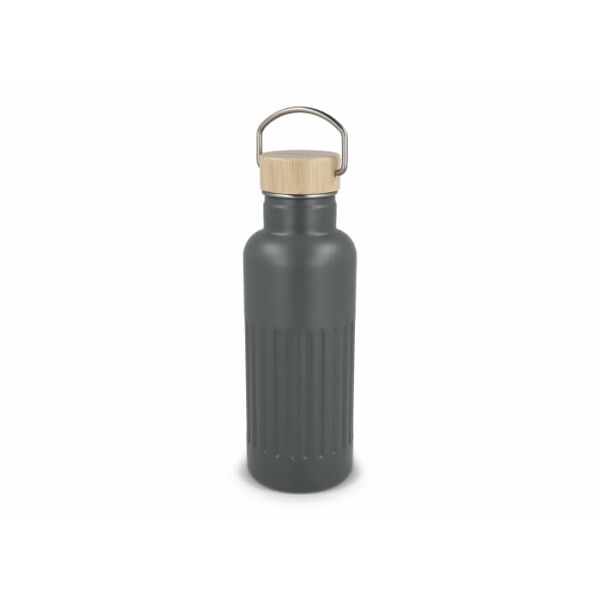 Recycelte Edelstahl-Isolierflasche mit 500 ml Fassungsvermögen und auslaufsicherem Bambusdeckel. Der Flaschenkörper hat ein modernes Streifenmuster, in einer Geschenkbox verpackt.