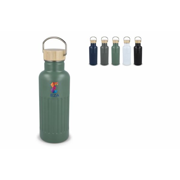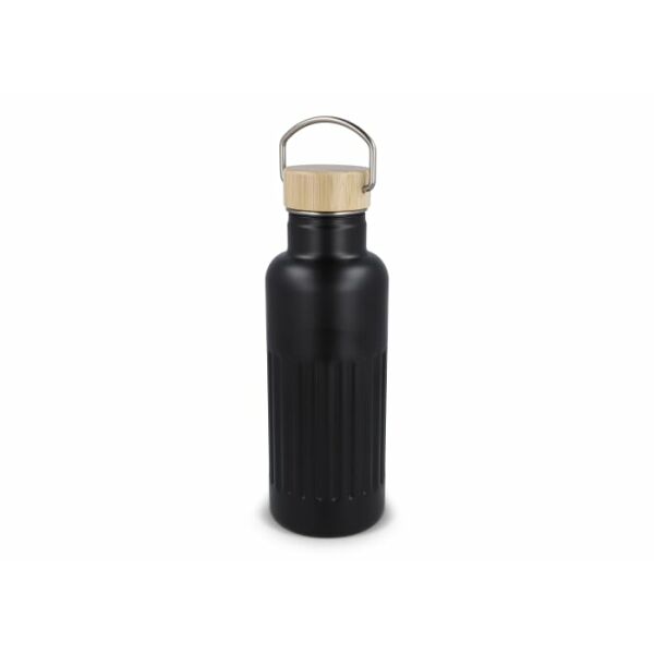 Recycelte Edelstahl-Isolierflasche mit 500 ml Fassungsvermögen und auslaufsicherem Bambusdeckel. Der Flaschenkörper hat ein modernes Streifenmuster,…