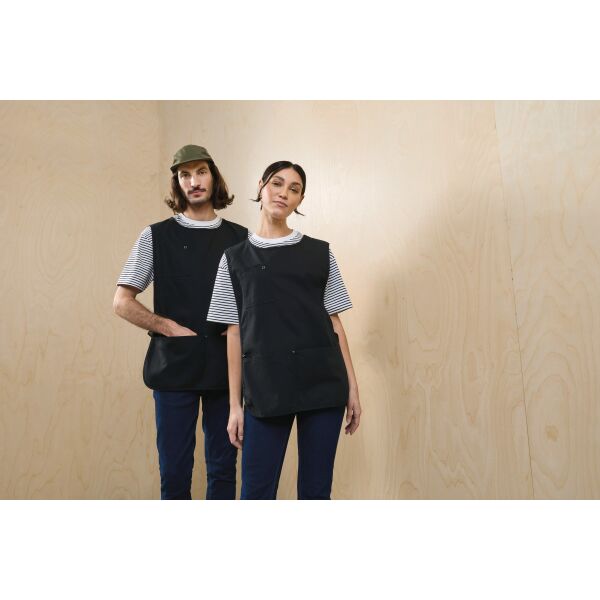 60 % Baumwolle / 40 % recycelter Polyester, 310 g/m². Widerstandsfähiger Canvas. Verstellbare Träger im Gürtelstil mit Clipschnalle. Brusttasche links Zwei große, tief sitzende Taschen für Tablets.